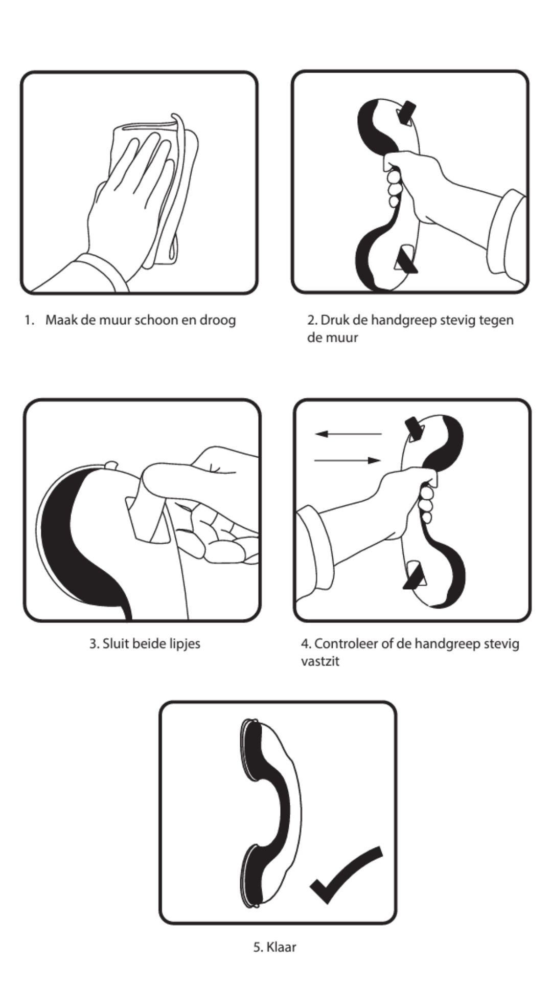 WICHTIG: Der Haltegriff ist ausschließlich als Gleichgewichtshilfe konzipiert und darf nicht als Stütze für das Körpergewicht verwendet werden. Übe kein Körpergewicht auf dieses Produkt aus. (Wenn der Griff Körpergewicht tragen oder als Hebelhilfe verwendet werden soll, wird empfohlen, eine fest montierte Haltestange zu installieren.) Für optimale Haftung und Sicherheit sollte der Griff nur auf glatten, nicht porösen Oberflächen wie Glas, Acryl oder glänzenden Fliesen angebracht werden. Nicht auf strukturierten Fliesen, porösen Oberflächen oder in der Nähe von Fugen anbringen, da dies die Saughaftung und Stabilität beeinträchtigen kann.