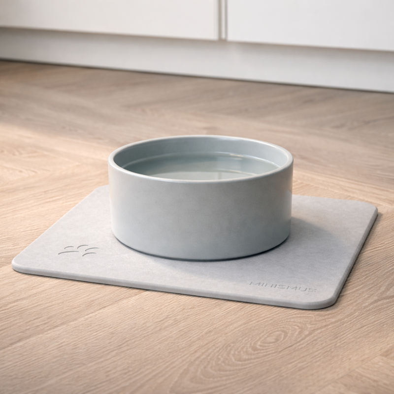 El comedero para perro Minismus con alfombrilla de diatomita está diseñado para mantener el suelo seco, limpio y seguro.