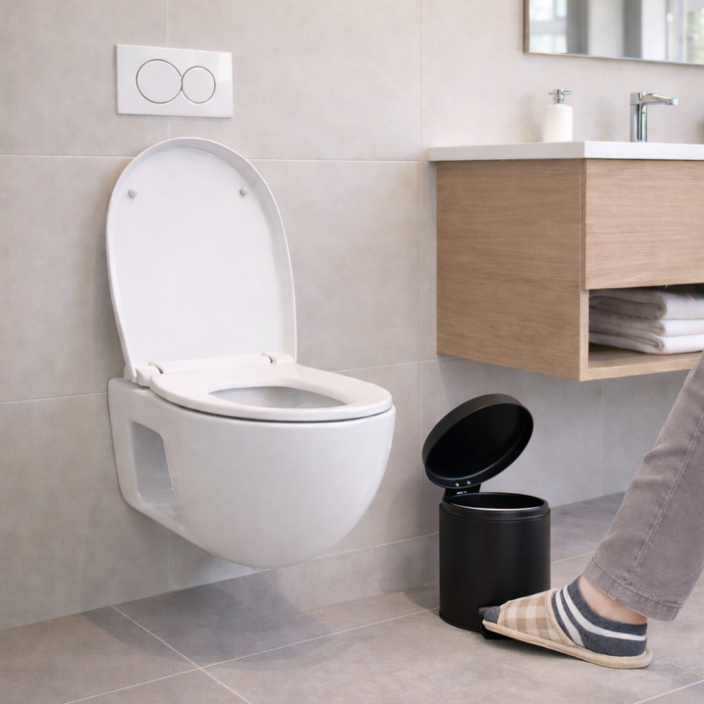 Diseñado para espacios reducidos, este cubo con pedal encaja perfectamente al lado del inodoro o bajo el lavabo, sin ocupar espacio innecesario. La tapa de cierre suave se baja de forma silenciosa y fluida, ayudando a mantener un ambiente tranquilo y limpio en tu baño. El mecanismo de pedal permite un uso sin manos, lo que lo hace más higiénico para las rutinas diarias.