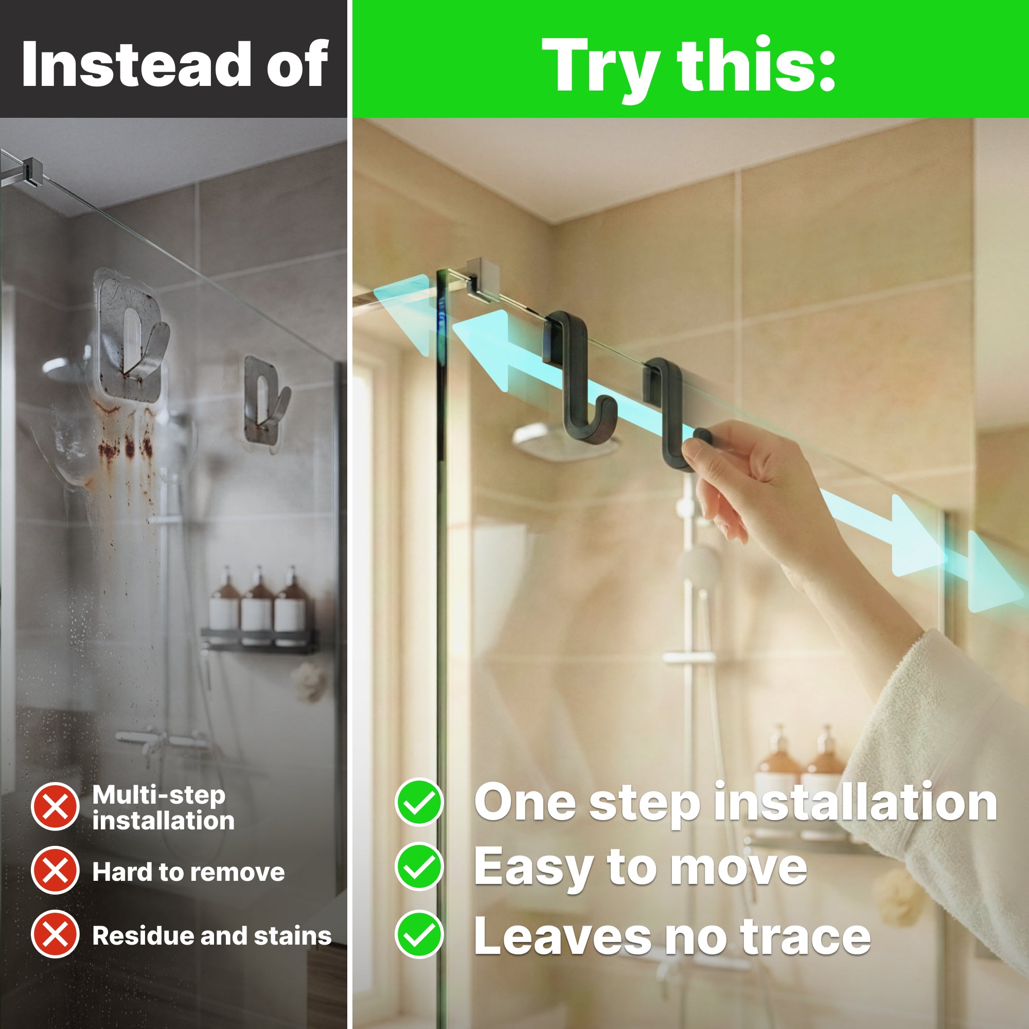 Il design intelligente consente un montaggio facile e veloce: basta appenderli sulla porta della doccia senza bisogno di forature, viti o adesivi. Puoi iniziare a usarli subito, senza complicazioni.